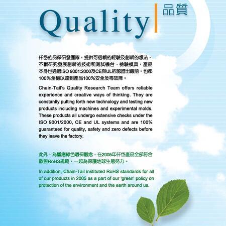 此外,為響應(yīng)綠色環(huán)保觀念,在2005年仟岱產(chǎn)品全部符合歐盟ROHS規(guī)范,一起為保護(hù)地球生態(tài)努力。